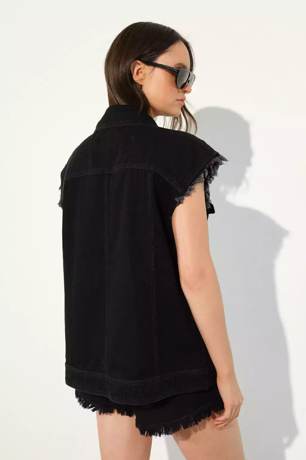 Chaleco de denim con sisa desflecada y corte en la cintura. Tiene bolsillos laterales en el frente de la prenda.